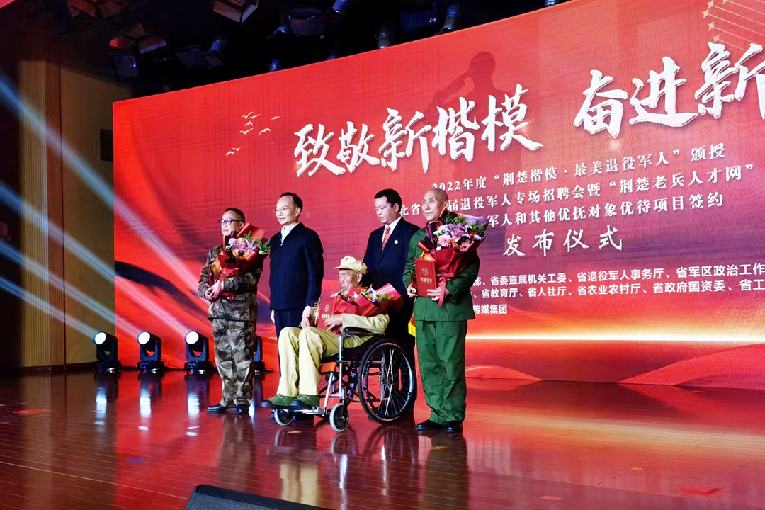 2022年度“荊楚楷?!ぷ蠲劳艘圮娙恕鳖C授儀式隆重舉行!本次活動由省委宣傳部、省委直屬機關工委、省退役軍人事務廳、省軍區(qū)政治工作局、省總工會、省教育廳、省人社廳、省農(nóng)業(yè)農(nóng)村廳、省國資委、省工商聯(lián)等單位聯(lián)合主辦。湖北省副省長公安廳長徐文海,省退役軍人事務廳廳長楊愛東等領導出席并頒授獎章,各地市州事務局局長和省關愛退役軍人協(xié)會部分副會長出席活動。省關愛退役軍人協(xié)會副會長宋凱出席活動并于前排就坐。