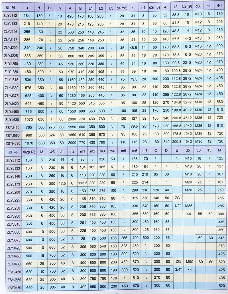 ZLYJ系列減速機(jī)是為了塑料螺稈擠出機(jī)配套設(shè)計(jì)的高精度硬齒面帶推力座的傳動(dòng)部件。產(chǎn)品設(shè)計(jì)采用 JB/T8S53-2001所規(guī)定的各項(xiàng)技術(shù)范圍。其特點(diǎn)是齒輪和軸類零件采用了高強(qiáng)度合金鋼。齒輪經(jīng)滲碳、淬火、磨齒工 藝加工。齒輪精度為GB10095-88.6級(jí)。齒面硬度HRC54-62。在空心輸出軸前端配置有超規(guī)格的推力軸,承受螺桿的工作 軸向力。軸承和油封等主要標(biāo)準(zhǔn)皆采用國內(nèi)優(yōu)質(zhì)產(chǎn)品,也可按用戶需要,配裝進(jìn)口產(chǎn)品。整機(jī)具有體積小,承載能力 高、傳動(dòng)平穩(wěn)、噪聲低、效率高等特點(diǎn)。產(chǎn)品性能已達(dá)到國際先進(jìn)水平,可替代同類型進(jìn)口產(chǎn)品使用。本系列產(chǎn)品中的規(guī) 格和傳動(dòng)比為現(xiàn)有用戶的常用數(shù)據(jù)。用戶在選用時(shí),可將螺稈的實(shí)際傳動(dòng)扭矩與許用輸出扭矩為準(zhǔn)選型。若需與橡膠擠出機(jī)配套,因橡膠擠出機(jī)沖擊力較塑料強(qiáng),請(qǐng)用戶提出具體技術(shù)參數(shù),向我廠咨詢?cè)俅_定選型。